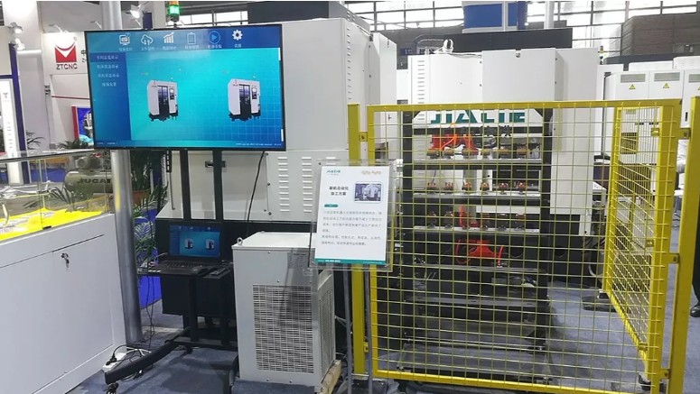 其中,引人矚目的是由機(jī)械手與佳鐵雕銑機(jī)組成的自動(dòng)化解決方案,并在現(xiàn)場(chǎng)演示全自動(dòng)上下料紫銅電極加工,客戶更可以從現(xiàn)場(chǎng)LED顯示屏中直觀了解到產(chǎn)品生產(chǎn)情況,即生產(chǎn)管理系統(tǒng)。從這個(gè)基本的自動(dòng)化單元展示出廣東佳鐵對(duì)于未來(lái)工廠實(shí)現(xiàn)智能制造的構(gòu)思和實(shí)踐能力,同時(shí)也體現(xiàn)出為客戶提供智能制造解決方案的能力。